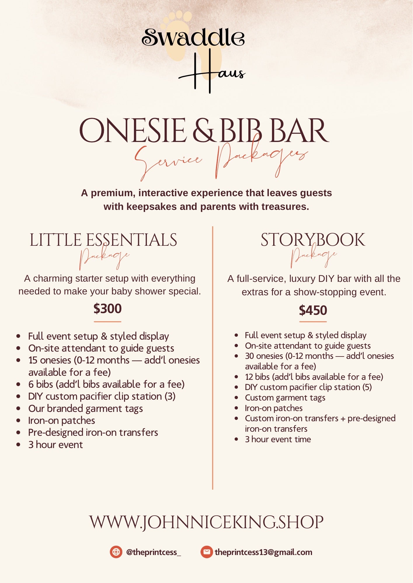 Looking for a fun and interactive experience at your baby shower or sprinkle? We’ve got you covered. We offer two packages for your convenience. Check our FAQs below for more info.